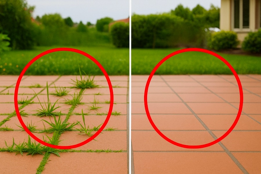 Para maleza entre baldosas o adoquines, lo ideal es rociar con precisión en las uniones y dejar que el sol haga el resto.